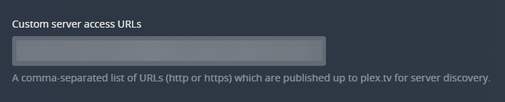 A comma-separated list of URLs (either HTTP or HTTPS) that will be published to plex.tv for server discovery. This can be very useful in a few cases: if you’re using a reverse proxy in front of the media server, or if your networking configuration is otherwise unique. For instance, if you have your own custom domain with a subdomain.